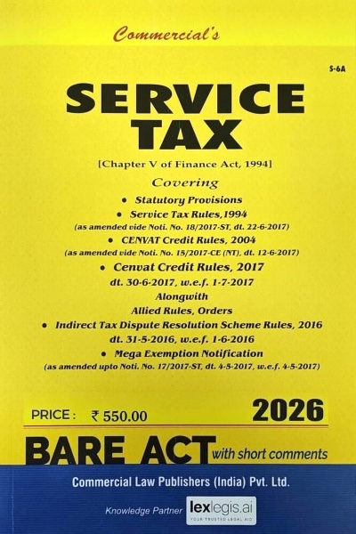 Service Tax with Rules and Allied Rules is a comprehensive compilation of the statutory provisions governing service tax in India prior to the introduction of GST. This 2026 edition presents the complete and authentic text of Chapter V of the Finance Act, 1994, along with all relevant amendments as they stood up to 2017. Designed as a Bare Act with short comments, the book ensures clarity, precision, and ease of reference, making it especially suitable for examination purposes, legal research, and practical application. It serves as a dependable source for understanding the legislative framework, compliance requirements, and transitional provisions of the Service Tax regime.