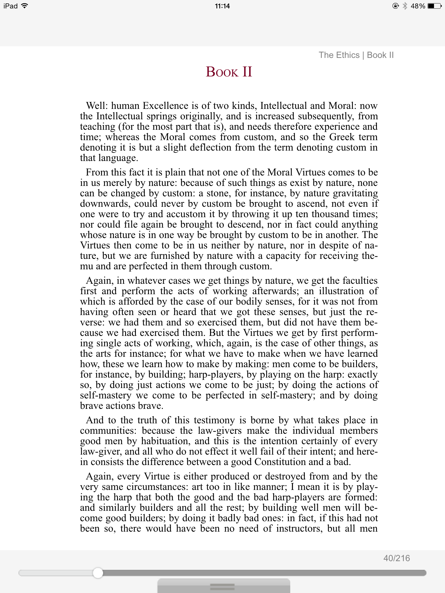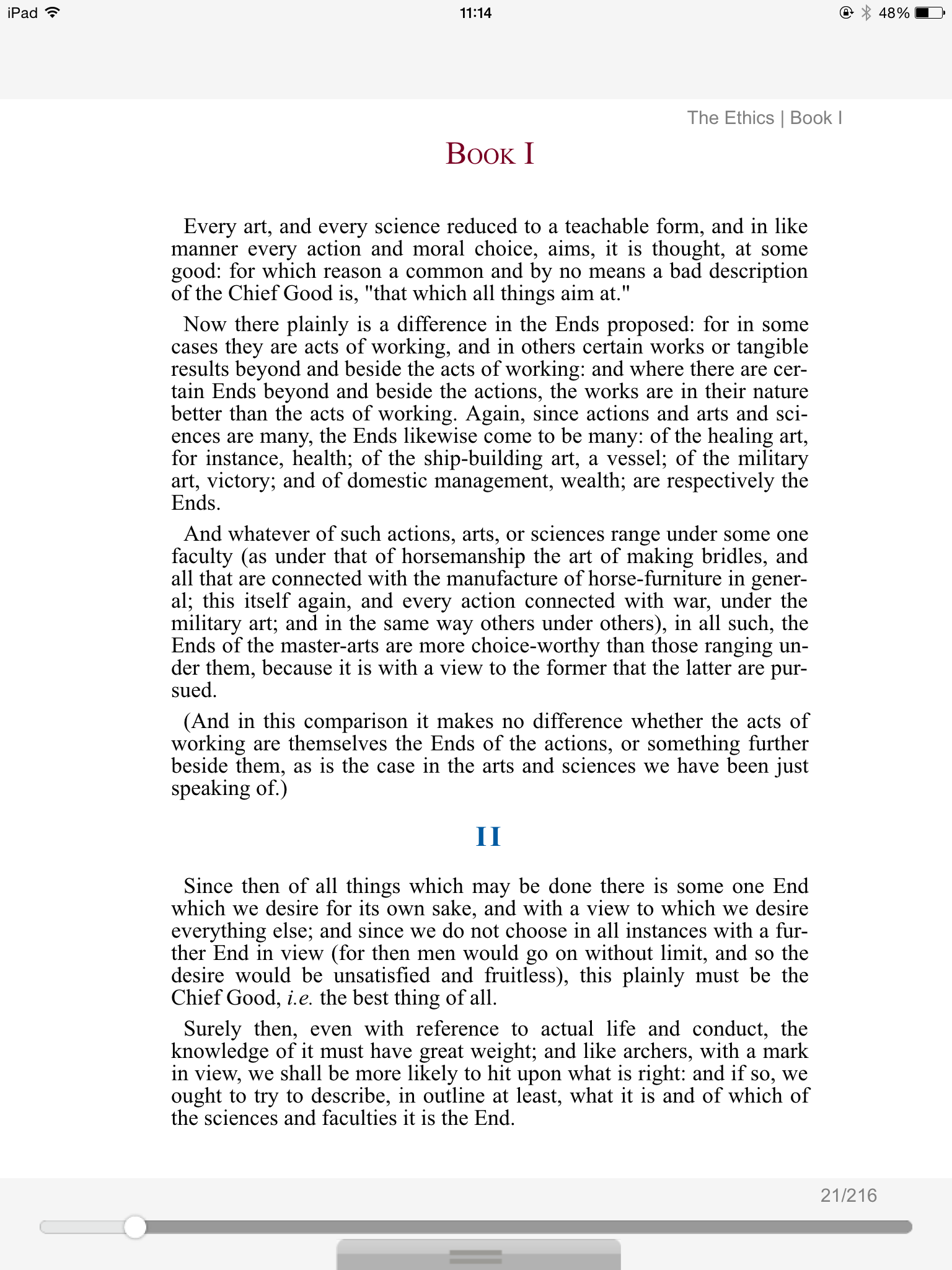 The two parts of this treatise are mutually complementary, but in a literary sense each is independent and self-contained. The prose to the Ethics is an introduction to the whole subject, not merely to the first part; the last chapter of the Ethics points forward to the Politics, and sketches for that part of the treatise the order of enquiry to be pursued (an order which in the actual treatise is not adhered to).