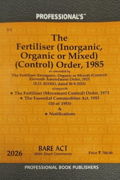 This edition presents the updated text of The Fertiliser (Inorganic, Organic or Mixed) (Control) Order, 1985, incorporating all amendments up to 2026. It reflects the latest regulatory framework governing the manufacture, sale, distribution, quality control, and movement of fertilisers in India. The book also includes allied statutory materials essential for a complete understanding of fertiliser regulation under the Essential Commodities regime.