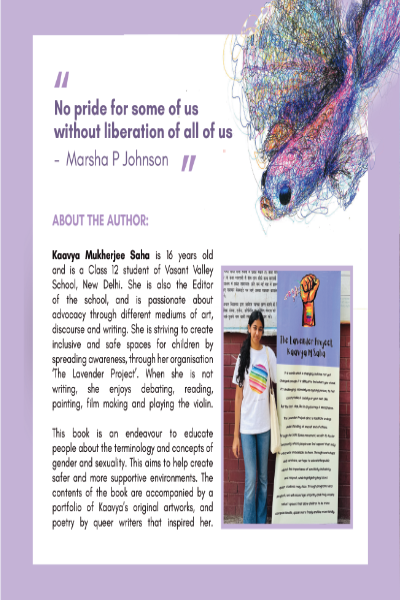 This book is an endeavour to educate people about the terminology and concepts of gender and sexuality. This aims to help create safer and more supportive environments. The contents of the book are accompanied by a portfolio of Kaavya's original artworks, and poetry by queer writers that inspired her.