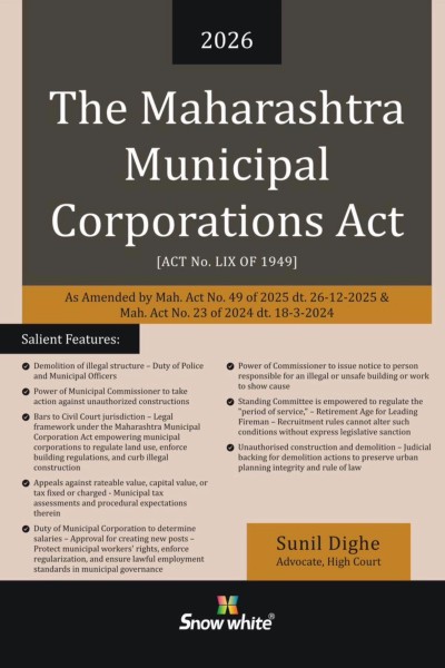 The Maharashtra Municipal Corporations Act (2026 Edition) presents the updated text of Act No. LIX of 1949, incorporating amendments made by Maharashtra Act No. 49 of 2025 and Maharashtra Act No. 23 of 2024. This book provides a comprehensive statutory framework governing the constitution, powers, duties, and functioning of municipal corporations in Maharashtra. Authored by Sunil Dighe, Advocate, High Court, the work serves as an authoritative reference on urban local governance, municipal administration, and regulatory control within city limits.
