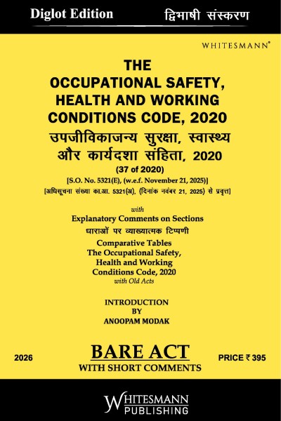 This Diglot Edition of The Occupational Safety, Health and Working Conditions Code, 2020 presents the complete and updated Bare Act in both English and Hindi, making it accessible to a wider readership. Enforced with effect from 21 November 2025, the Code consolidates multiple labour laws into a unified legal framework governing occupational safety, health standards, and working conditions across establishments. Published by Whitesmann, this 2026 edition includes statutory notifications, bilingual text, and authoritative presentation aligned with current enforcement status.