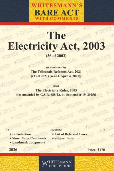 This 2026 edition of The Electricity Act, 2003 presents the updated and consolidated bare text of India’s principal electricity legislation, incorporating all amendments up to date, including those introduced by the Tribunals Reforms Act, 2021. Along with the Electricity Rules, 2005 (as amended), the book offers a reliable statutory reference reflecting the current legal framework governing generation, transmission, distribution, trading, and regulation of electricity in India. Designed to preserve statutory authenticity, the text is reproduced accurately with brief comments to aid understanding and practical application.