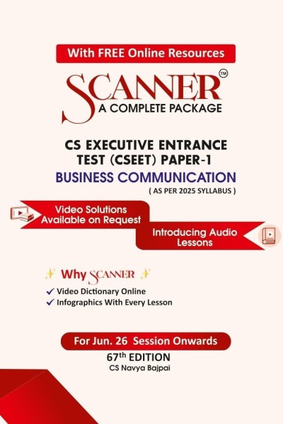 Scanner | CSEET Paper-1 Business Communication | For June 2026 Session Onwards | 67th Edition is a comprehensive exam-oriented preparation guide designed for students appearing for the CS Executive Entrance Test (CSEET). The book focuses on developing essential communication skills required for aspiring Company Secretaries and covers the latest 2025 syllabus prescribed by the Institute of Company Secretaries of India (ICSI). It presents concepts of business communication in a clear and structured manner, enabling students to understand professional communication practices, language usage, and presentation techniques. The book combines theoretical explanation with exam-focused practice material and integrates modern digital learning support such as video solutions, audio lessons, and interactive resources to enhance conceptual clarity and revision efficiency.