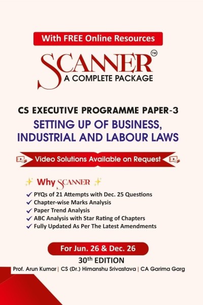 Scanner | CS Executive Programme Paper-3 Setting Up of Business, Industrial and Labour Laws | For June 2026 & December 2026 | 30th Edition is a comprehensive exam-oriented practice resource designed for students preparing for the CS Executive Programme conducted by the Institute of Company Secretaries of India (ICSI). The book provides a structured compilation of previous year examination questions along with exam trend insights, enabling students to understand the pattern and weightage of topics within the subject. It focuses on legal and regulatory aspects involved in establishing businesses in India, along with the framework governing industrial relations and labour legislation. Presented in a chapter-wise format, the scanner helps students systematically revise key provisions relating to business registration, regulatory compliance, labour welfare laws, and industrial dispute mechanisms. Updated with the latest amendments in business and labour legislation, the book ensures that aspirants study the most current legal framework relevant to corporate operations and labour management.