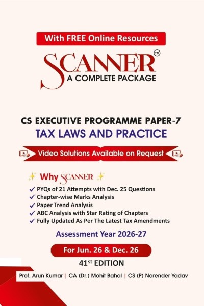 Scanner A Complete Package | CS Executive Programme Paper 7 | Tax Laws and Practice is a comprehensive exam-oriented preparation guide designed for students appearing in the CS Executive examination. The book compiles previous years’ questions along with detailed analytical insights to help students understand the examination pattern, frequently tested topics, and conceptual application of taxation laws. Carefully structured according to the latest CS Executive syllabus, the book helps students revise important provisions of tax laws while simultaneously practicing real examination questions. The content is updated with the latest amendments relevant for the Assessment Year 2026–27 and is designed to support candidates preparing for the upcoming CS Executive examination sessions.