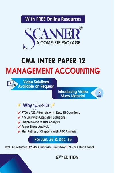 Scanner A Complete Package | CMA Inter Paper 12 | Management Accounting is a comprehensive exam-oriented study guide designed for students preparing for the CMA Intermediate examination. The book provides a structured compilation of previous years’ questions along with model question papers and analytical tools that help students understand exam patterns, key topics, and practical application of management accounting concepts. Updated according to the latest CMA syllabus and examination requirements, the book ensures students have access to relevant and current study material. It supports both conceptual clarity and exam-focused practice, making it an essential resource for achieving strong performance in the examination.