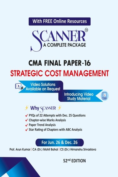 Scanner A Complete Package | CMA Final Paper 16 | Strategic Cost Management is a comprehensive exam-oriented study guide designed for students preparing for the CMA Final examination. The book provides a structured compilation of previous years’ questions along with analytical tools that help students understand exam patterns, key topics, and practical application of strategic cost management concepts. Updated according to the latest CMA syllabus and examination requirements, the book ensures students have access to relevant and current study material. It supports conceptual clarity as well as exam-focused preparation, making it an essential resource for achieving high performance in the CMA Final level.